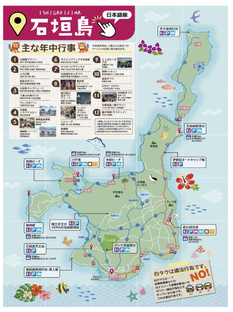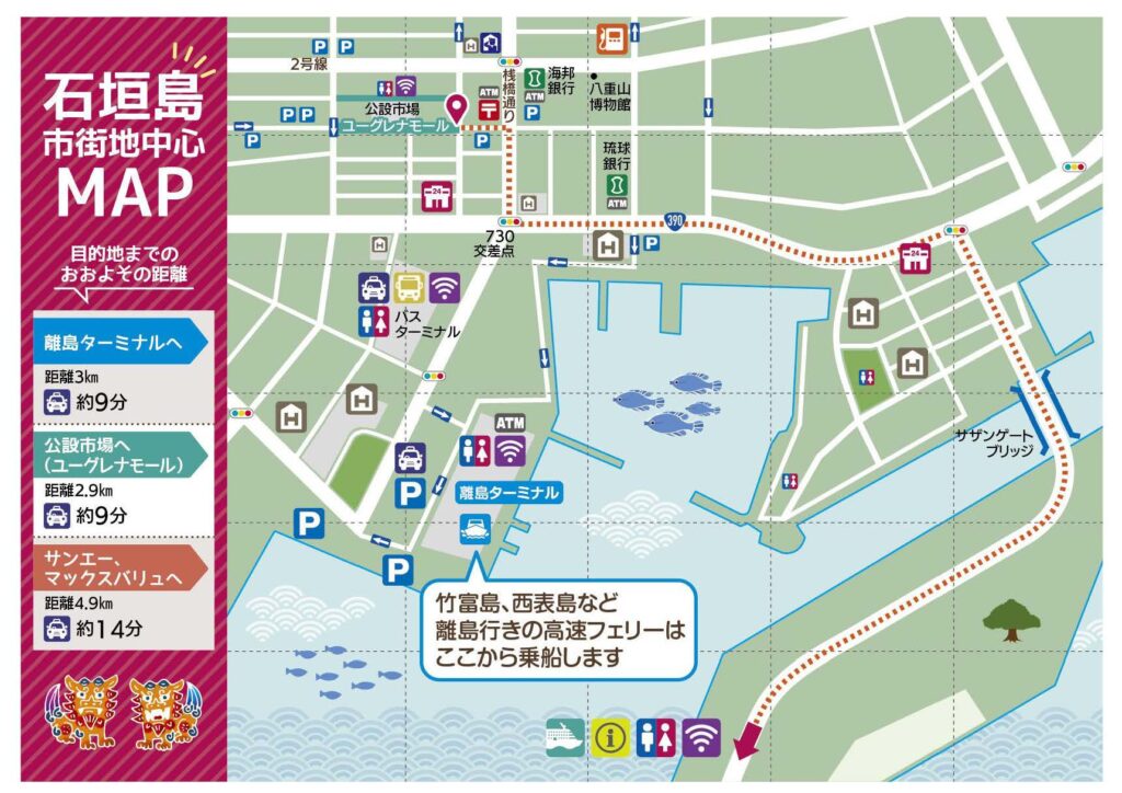 石垣島旅行、石垣島レンタカー利用時に便利なMAPを掲載しました。(石垣市ホームページより引用)ダウンロードページから印刷も出来ます。石垣島の旅の案内や、準備にご利用ください。